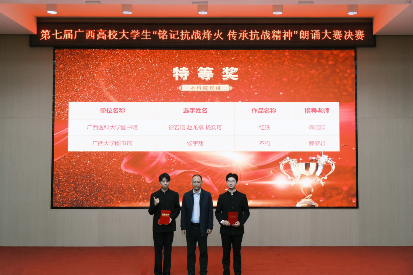 11月16日,由广西高等教育学会图书馆专业委员会主办,南宁师范大学承办的第七届广西高校大学生“铭记抗战烽火 传承抗战精神”朗诵大赛决赛在南宁师范大学明秀校区成功举办。本次大赛共吸引52所高校的13571组作品参赛,其中我校参赛作品843组。经过校内选拔、网络投票、专家评审和现场决赛的层层选拔,我校最终荣获本科院校组特等奖及三等奖各1项,优秀奖7项。我校图书馆因组织工作突出获优秀组织奖,谭欣欣、姜明月老师获优秀指导教师奖。另有259组选手获得校内选拔赛奖项。